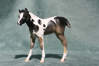 #105 - Cocolona - Resin foal, 5" tall, shetland pony filly standing. This one is painted black and white tobiano.